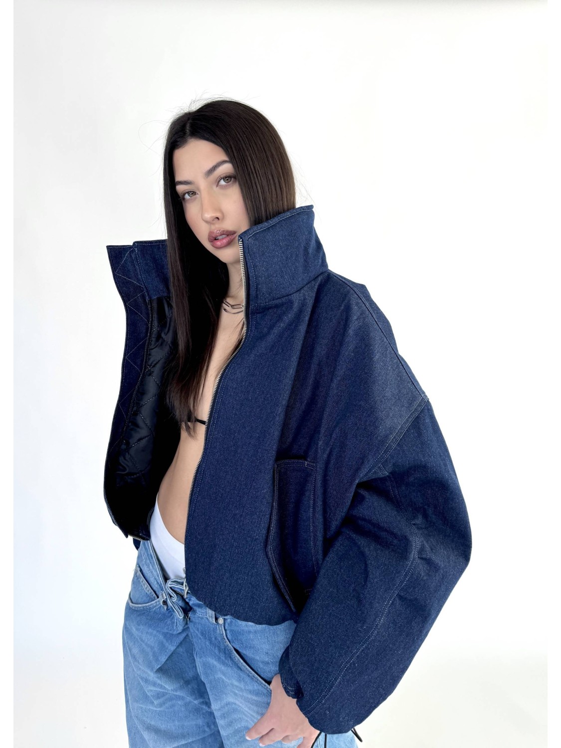 Krótka wersja kurtki bomber naszej bestseller'owej kolekcji 'denim" zapinana na metalowy zamek, uszyta z najlepszej jakości denimu w kolorze dark blue