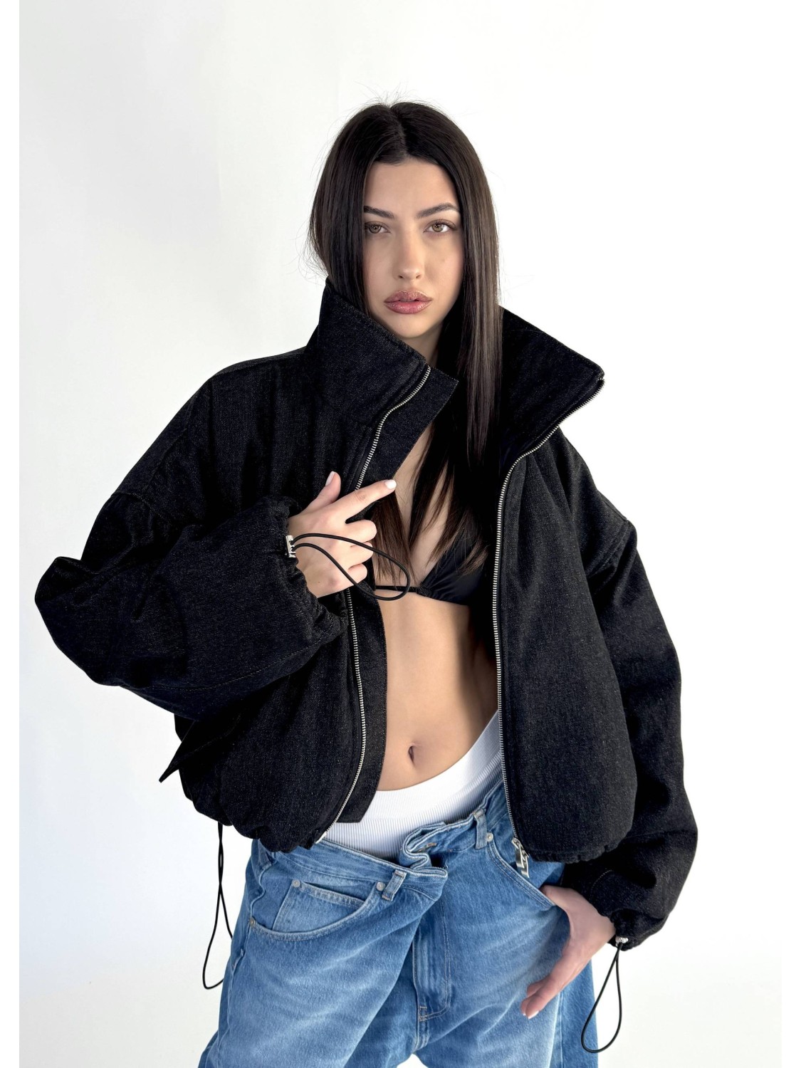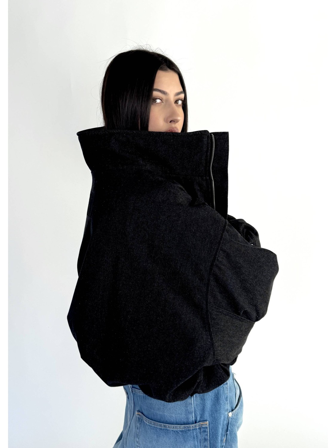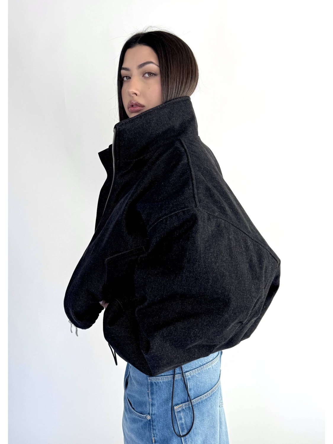 Krótka wersja kurtki bomber naszej bestseller'owej kolekcji 'denim" zapinana na metalowy zamek, uszyta z najlepszej jakości denimu w kolorze washed black