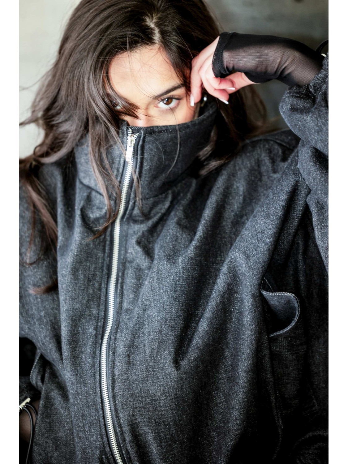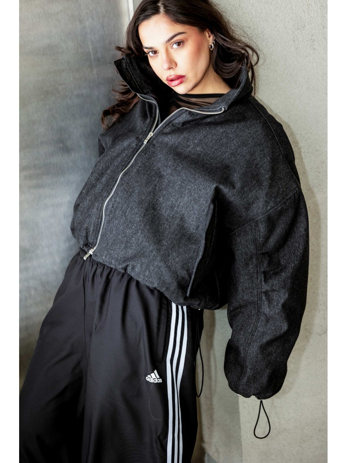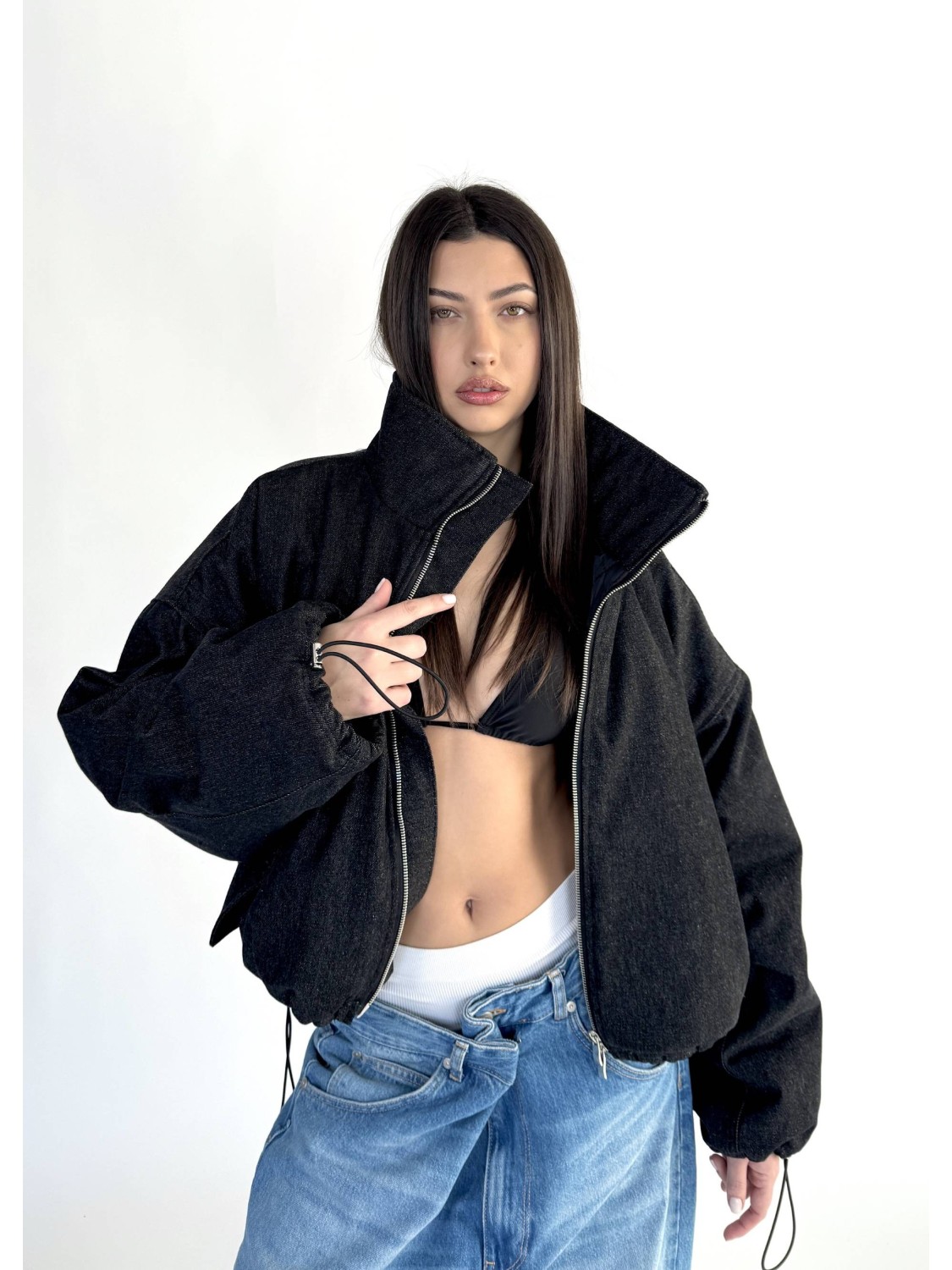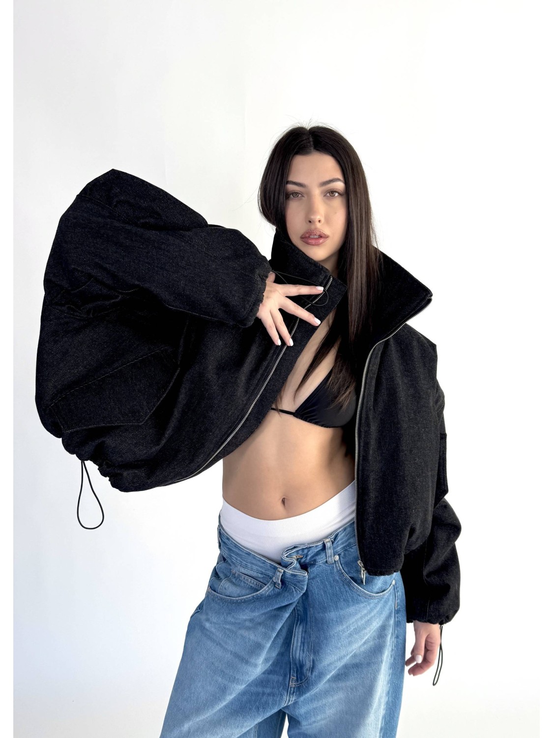 Krótka wersja kurtki bomber naszej bestseller'owej kolekcji 'denim" zapinana na metalowy zamek, uszyta z najlepszej jakości denimu w kolorze washed black