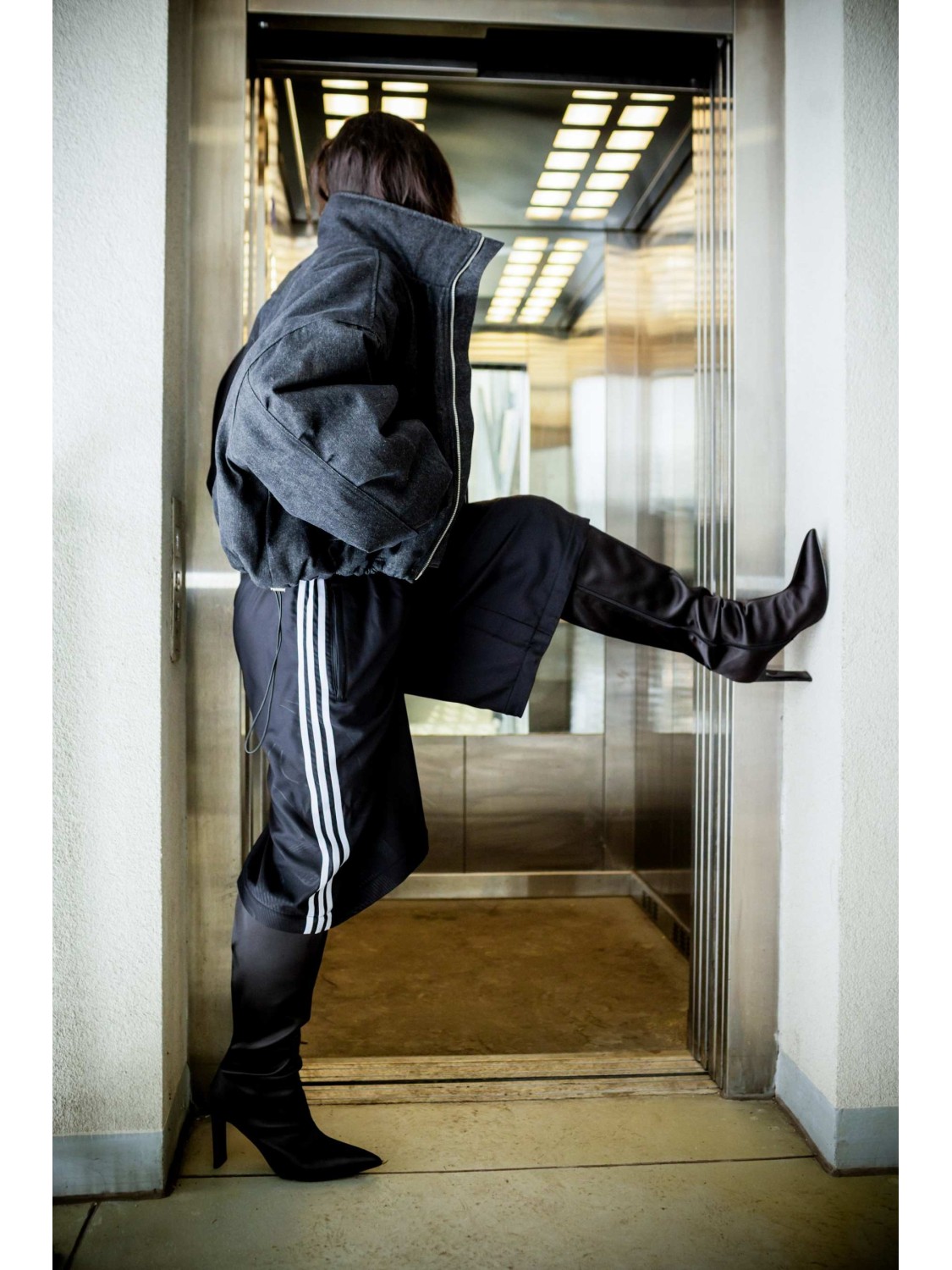 Dół kurtki wykończony elastyczną gumką i metalowymi stoperami (możliwość regulacji i kilka sposobów noszenia)